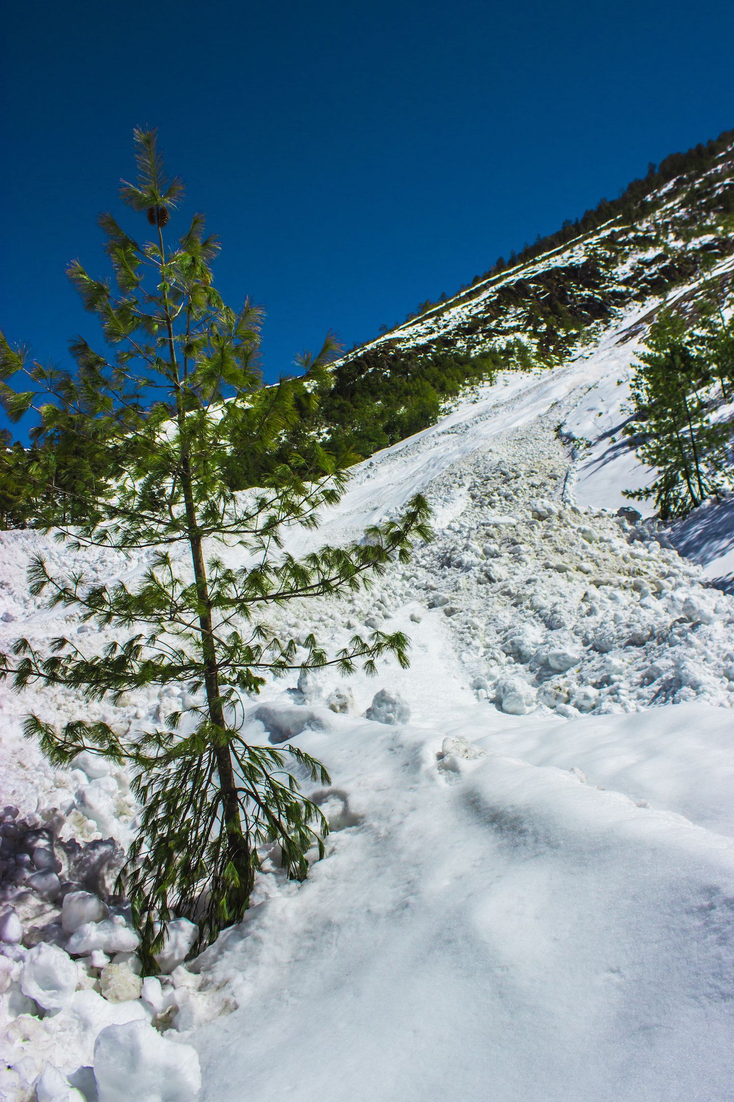 In front of us, we were slowly approaching a smooth concave mountain face known as Heaven’s Door. An auspicious place to be buried, souls have to climb their steep way up to heaven. The entire smooth surface was covered in snow, except the visible lines of avalanches that had come down. We had been managing the snow alright so far, but it was near Heaven’s Door that we hit a roadblock. We came upon yet another avalanche site… but this time it was on our side of the valley, with all the snow spread over the entire trail.
