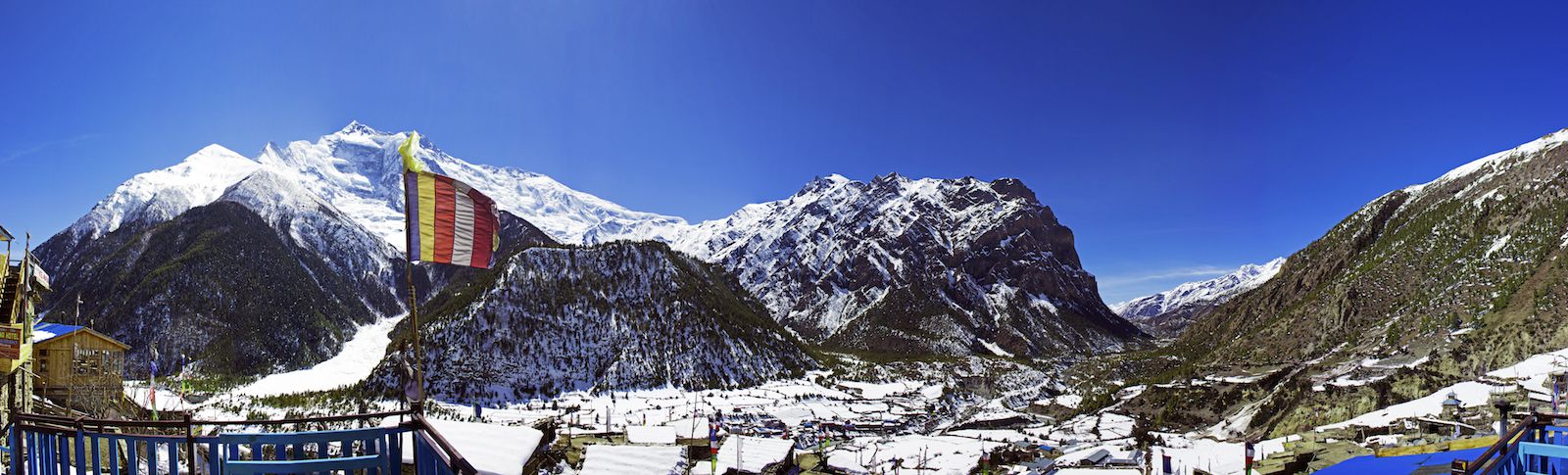 Panorama with the Annapurna Himalayan Range viewed from Upper Pisang, Nepal - click to enlarge